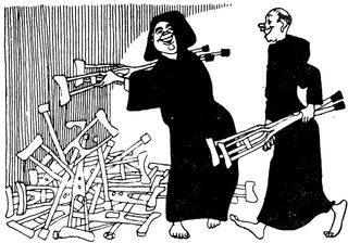 Никто, кроме монахов, конечно, не знает, что этим первым исцелившимся по большей части бывает нанятый монастырем ловкий пройдоха. За небольшую мзду он проделывает это каждую неделю. Чудо выглядит настолько убедительным, что и некоторые по-настоящему больные люди, возбужденные и наэлектризованные всей обстановкой Лурда, иной раз также чувствуют, как к ним внезапно возвращаются силы.