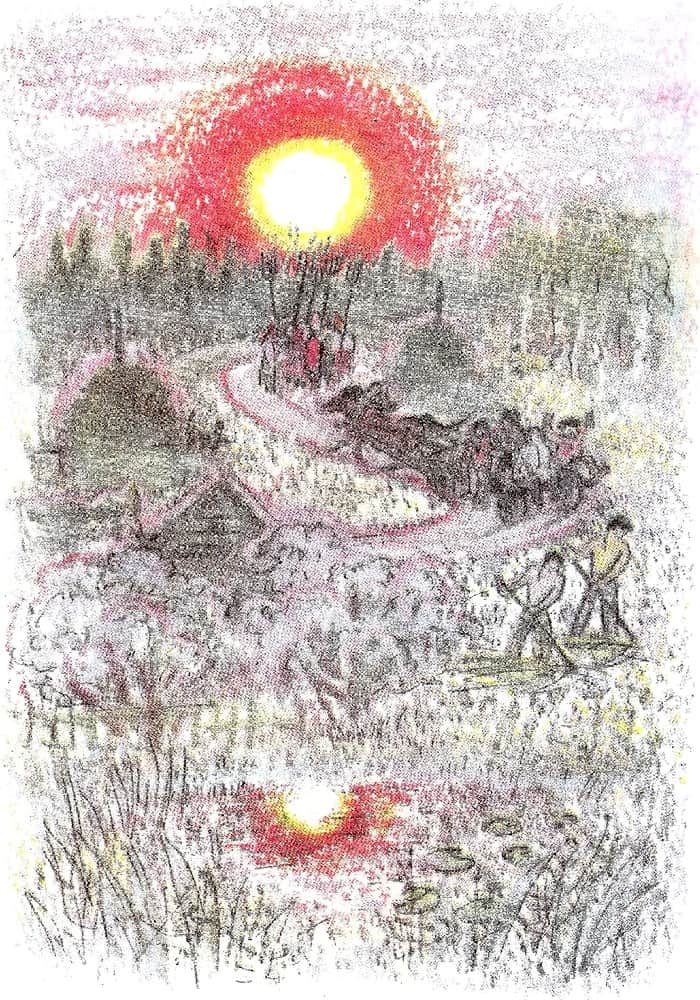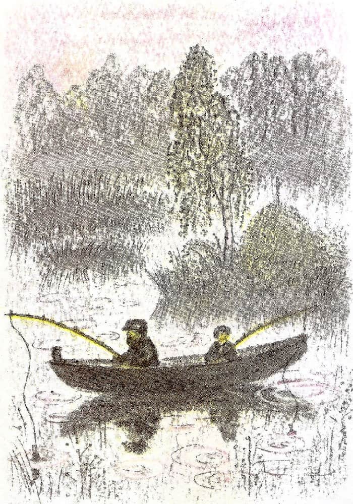 На зорьке дед поднял меня. Я поднялся бодро. Босиком по росистой травке добежал до лодки. Уселись. Поплыли.