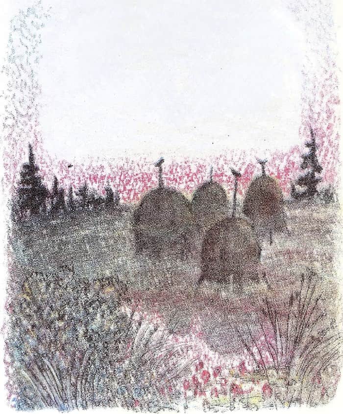 — У солнца каждое озеро — ведро с водой. Вот оно и носит на своём коромысле эти вёдра-озёра, — сказала бабушка внучке и принялась за свои дела по хозяйству.