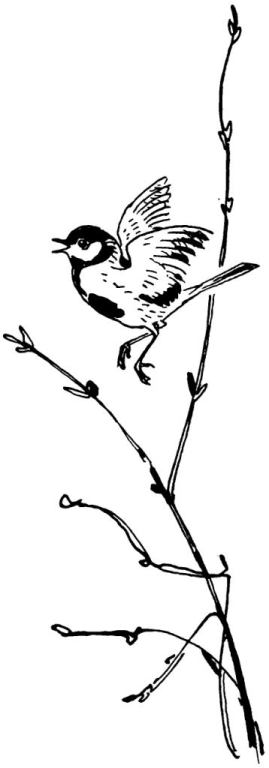 Я полюбовался небом и вдруг услышал удивительную птичью песенку, будто кто-то шел по улице с ведрами на коромысле, и они, раскачиваясь, мерно скрипели: «Цыпи-цыпи, цыпи-цыпи, цыпи-цыпи». Догадался, что поет синица-кузнечик. Где же она? Я окинул взглядом высокие тополя и увидел птичку на длинном голом суку. Но что это? Не сошла ли она с ума? Синичка прыгала вдоль сучка, поворачиваясь в воздухе кругом. Только хвост мелькал. И все время напевала: «Цыпи-цыпи, цыпи-цыпи».