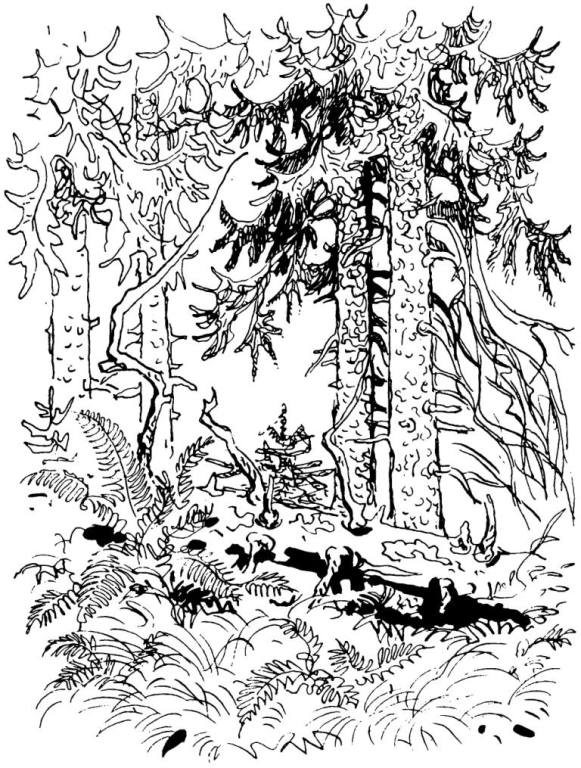 От воды ноют зубы и лоб, но как же хорошо здесь в сырой прохладе среди елочек, пихт и рябин, никогда не видевших человека! Здесь открывался исток лесной поэзии — ведь от этой седой ключевой струи зависит и каждая ель, и моховая подушка, и рябчики, и ястребиные гнезда, и голоса дроздов.