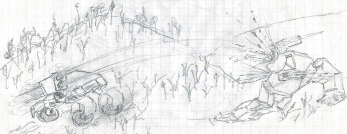 Два легких и быстрых броне-квадробота, лихо перепрыгивая с холма на холм, летя во весь опор, выскочили на очередное предгорье, чтоб получить визуальное подтверждение на АРЛ станцию. Необходимы были точные координаты для артиллерии, которая уже изготовилась на позиции, чтоб нанести удар. «Квадроботы» не остались незамеченными для группы из 5-и «Гиен», которые лихо перескакивая через низкие кустарники, обрушились на легкобронированные машины своими излучателями.