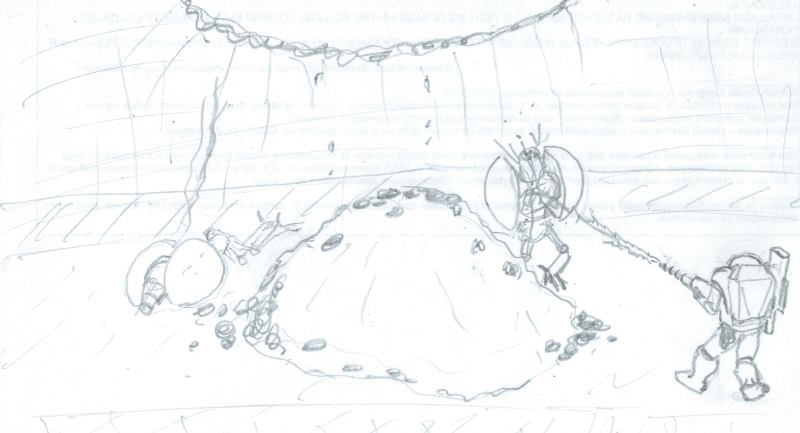 Бэнг! Сильный удар волной накрыл робота и отвлек его от группы людей. Он стремительно развернулся и метнул обе мины в сторону Брода. Тот ждал этого больше всего на свете. Мины, промазав, улетели куда-то за стену и там оглушительно взорвались, не причинив ему вреда. «Эх, винтовку потерял!». Он выстрелил из бластера метя в сочленения на руках и ногах, но тому его старания были, что укусы комара. «Спокойно, Брод, это всего лишь «Гладиатор». Он неуклюж и слаб против пехоты, если конечно та не кучкуется». Голос Джима приободрил его и подкинул идею. Перемахнув за стену того самого заваленного дома, Брод облетел его с другой стороны. Он зажал в свободной руке электромагнитную эм-ку и снова, пыхтя и «тужась», залез в щель, которая вела внутрь комнаты. «Гладиатор» действовал по «инструкции», что воодушевило Брода еще больше, потому что это означало, что там не живой пилот, а ИИ. Сильный удар тяжелым кулаком «подтолкнул» его глубже, и он снова оказался внутри той самой небольшой комнатки на 2-м этаже. Робот, не зная, что у этой заваленной конструкции есть другой выход принялся сосредоточенно выжигать отверстие своим лазером, превращая в пыль блоки и куски твердого засохшего нано-раствора. В какой-то момент перекрытие задрожало и частично обвалилось. В образовавшемся отверстии в облаке пыли и крошева мелькнула верхняя часть торса «Гладиатора» с основными сенсорами. Не долго думая он замахнулся термо-ударным копьем и вогнал его внутрь, метя в специально позировавшего ему Брода. Раскаленное лезвие зашипело, разрезая камень и перекрытия. «Ну, вот ты и попал!». Пригнув голову Брод оттолкнулся от пола комнаты и ударился плечами в потолок.
