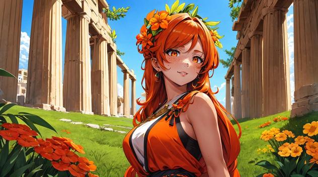 По лестнице мимо колоннады медленно ступала девушка с яркими оранжевыми волосами. Ее лицо было усеяно веснушками. Столь же оранжевые глаза и того же цвета хитон дополняли ее образ отмеченной солнцем девушки. Я даже сглотнул, при виде такой необычной красоты. Но помимо очаровательного лица с очень надменным выражением, ее фигура также была чертовски привлекательной и не менее величественной.