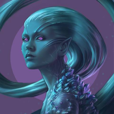 Точёное лицо, острые скулы и уши, но не это притягивает взгляд. Сияющие изнутри лиловые глаза на фоне чёрной склеры и длинные до пола пышные волосы такого же бирюзового цвета. Она выглядят мягкими и в то же время невероятно острыми. Непонятно, вырезаны они из кристалла или имеют иную структуру.
