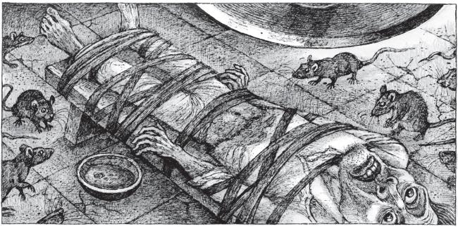 Я изнемог – изнемог до смерти – от этой долгой агонии, и когда наконец меня развязали и позволили мне сесть, я был почти в беспамятстве. Приговор, страшный смертный приговор, – вот последнее, что долетело до моего слуха. Затем голоса инквизиторов слились в сонное неясное жужжание. Оно вызывало в душе моей мысль вращения – быть может, вследствие сходства с шумом мельничного колеса. Но вскоре и оно замолкло – больше я ничего не слышал. Зато я видел – и с какой преувеличенной ясностью! Я различал губы судей. Они казались мне белыми – белее бумаги, на которой я пишу, – и неестественно тонкими, тонкими до уродливости, вследствие выражения твердости, непреклонной решимости, угрюмого презрения к человеческим мукам. Я видел, что губы эти еще решают судьбу мою, искривляются, произнося мой смертный приговор. Я различил в их движении слоги моего имени и содрогнулся, не уловив никакого звука. И еще с судорожным ужасом я заметил легкое, почти неуловимое колебание черных занавесей по стенам комнаты; а потом мой взгляд упал на семь высоких свечей, стоявших на столе. Сначала они явились передо мною как символ милосердия – показались мне светлыми ангелами, готовыми спасти меня; но в ту же минуту смертная истома охватила душу мою, каждый нерв моего тела затрепетал, точно прикоснувшись к вольтовой дуге, ангелы превратились в пустые призраки с огненными головами, и я увидел, что от них нечего ждать помощи. Но тогда в душе моей зазвучала, как могучая музыка, мысль о сладком покое могилы. Она явилась украдкой, неясная, и долго я не мог понять ее значения; когда же наконец мой ум освоился с нею, лица судей исчезли точно по волшебству, высокие свечи пропали, пламя их угасло, настала тьма кромешная; все чувства слились в одном головокружительном ощущении – как будто душа моя стремглав упала в преисподнюю. Затем вселенная превратилась в недвижность, немоту и мрак.
