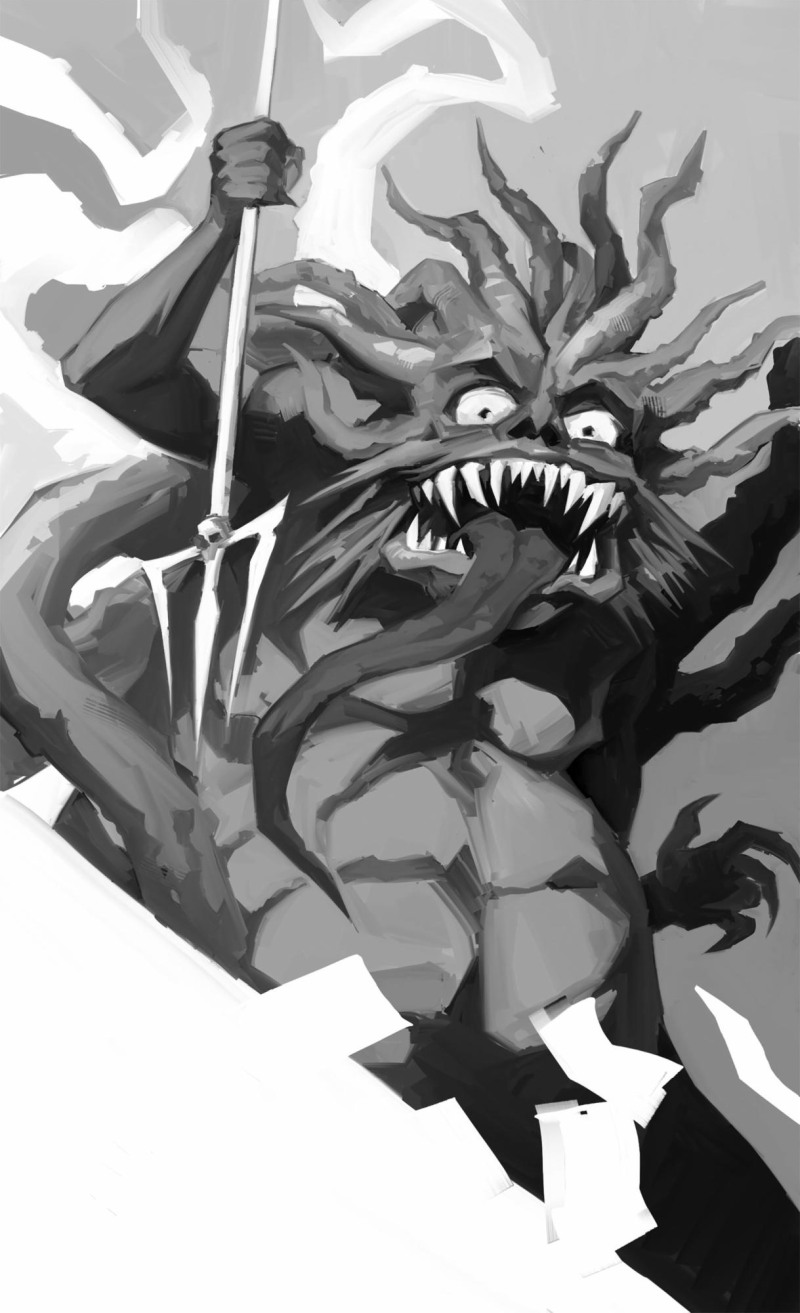 И без того немаленьких размеров демон тут же раздулся вширь, заполонив чуть не половину кабинета. Голова Зорека мгновенно обросла мощными щупальцами, а необъятное брюхо, покрытое броневыми пластинами, шлёпнулось на пол. Знатно потолстевший демон отбросил трезубец в сторону — теперь ему трудно было орудовать им так, чтобы не пораниться самому. Трезубец улетел в сторону круглого панорамного окна, из которого открывался вид на опустевшие танцполы, и, выбив стекло, пропал из виду.