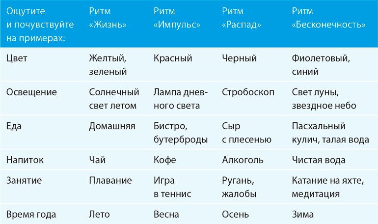 Ритм – основное понятие («язык») резонанса. У каждого пространства – свой ритм. У каждой ситуации – тоже свой ритм. И таких ритмов можно насчитать всего-то четыре вида. Каждый из них может ассоциироваться с каким-то цветом, видом освещения, едой, напитком, занятием, временем года и т. д. Мы различаем, излучаем и воспринимаем четыре ритма: «Жизнь», «Импульс», «Распад», «Бесконечность».