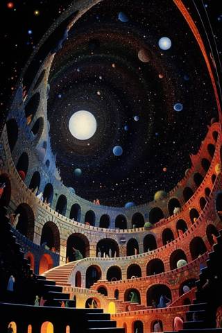 Прошла минута, и всё остановилось, детектив поднял голову и невольно охнул от открывшейся красоты. Ночь стала удивительнее и краше: он стоял в центре вавилонской башни, полной арок и переходов, лестниц и альковов. Мощёная гладкими камнями узкая дорожка для одного путника человеческих размеров и пропорций начиналась от его ног и уходила по кругу, постепенно вздымаясь выше.