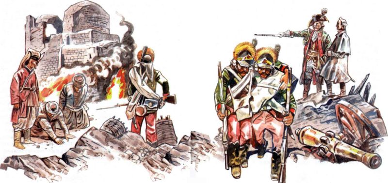 Следующие дни солдаты учились ходить в штыковую атаку, а по ночам, чтобы не видел противник, преодолевать препятствия, быстро забрасывать ров связанными охапками хвороста, бегать с длинными лестницами, ставить их к макету крепостной стены и мгновенно, один за другим, взбираться наверх.