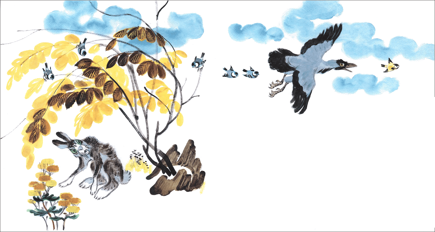 Вдруг из-за кустов вылетела ворона. Старый заяц шарахнулся в сторону и побежал куда глаза глядят. Оглянулся и видит: это ворона.