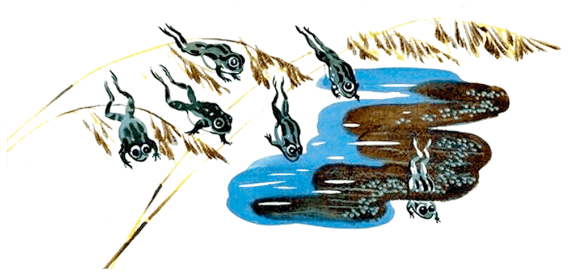 А на берегу болота сидели лягушки. Когда зайцы с шумом выскочили из камышей, лягушки одна за другой попрыгали в воду. Прыг — плюх! Прыг — шлёп! Только брызги в разные стороны!