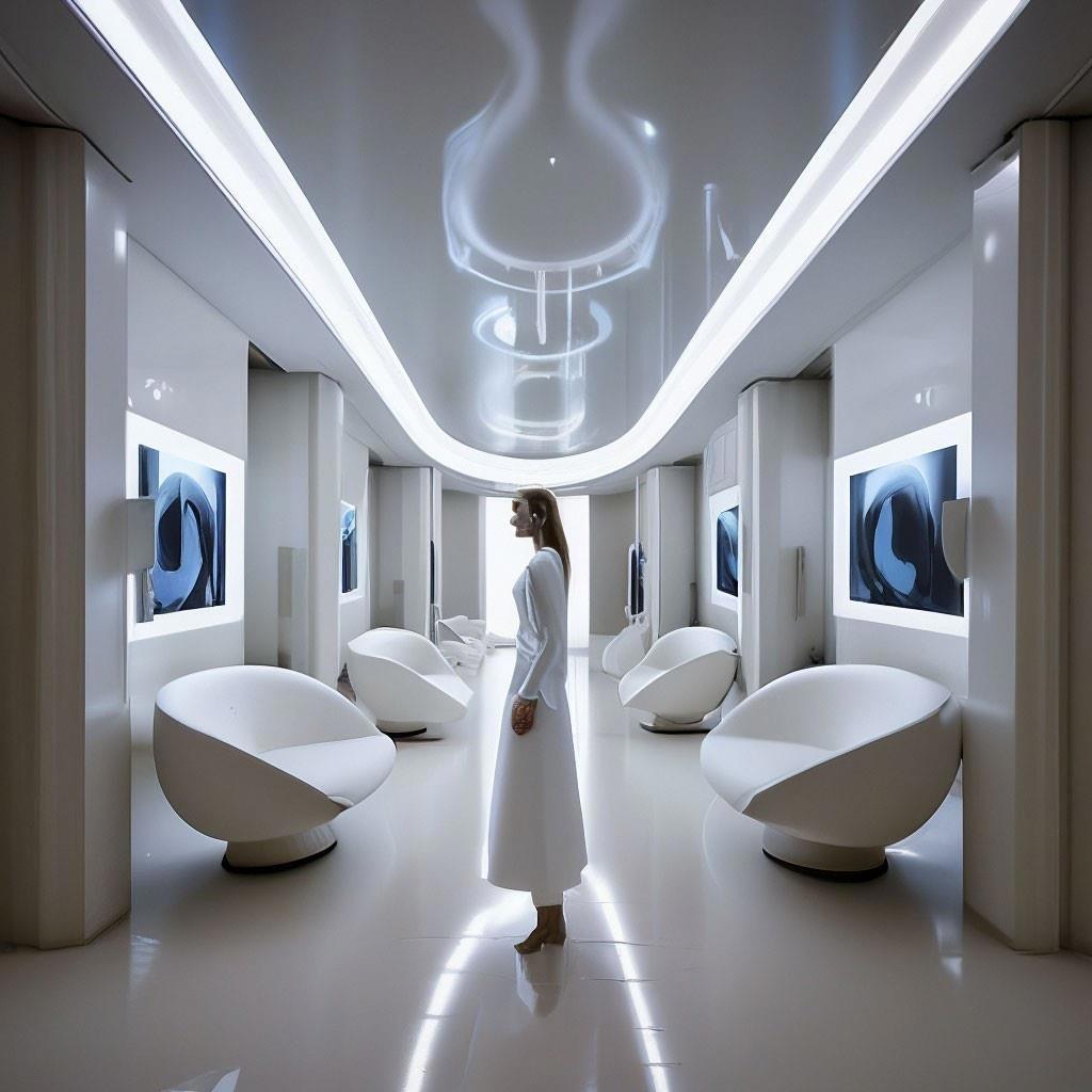 Проще назвать это фойе — капсулой космопорта в стиле нео-футуризм. Оу, как я прав-то... Вон и девушка в белом платье-юбке ко мне навстречу идет, как стюардессочка... В каком-то фильме такое точно видел, похожа крайне на... Зараза, не помню! На языке вертится, а вспомнить — никак. Бывает же такое, мозг играет в веселые игры.
