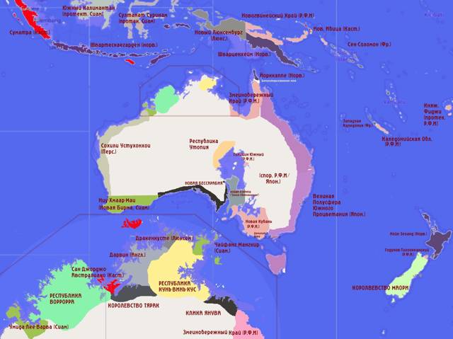 Восточная часть Австралии покрыта непроходимыми джунглями с переходом в саванну. Эта территория является спорной между Российской Федеративной Империей и японской квазинезависимой Великой Полусферой Южного Процветания. Для закрепления контроля над территорией на границе спорной зоны, на берегу Оранжевого Моря Р. Ф. И. (а точнее, Общество и некоторые промышленные дворянские кланы) строит Трансаустралийскую магистраль с Севера на Юг и построило несколько форпостов, в т. ч. город Голицын-Южный. На другой стороне моря в саванне существует террористическое/анархическое непризнанное государство Утопия, не поддерживающее связи с другими государствами.