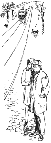 Мимо нас вниз шел трамвай. Вдруг через дорогу побежала собака крупная, серая, похожая на немецкую овчарку, но не овчарка. Она бросилась прямо под вагон. Я зажмурилась. Трамвай зазвонил и проехал вниз, а я боялась посмотреть на рельсы, потому что думала, что трамвай переехал собаку и что это то самое место. Но Коля потащил меня за рукав и сказал: