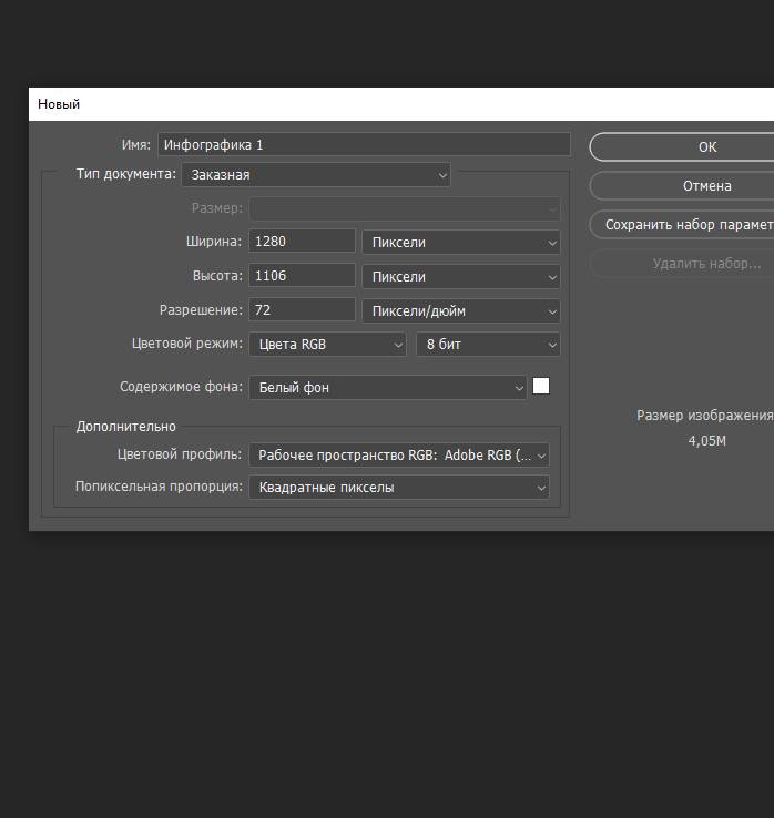 Запускаем программу Photoshop и создаём новое изображение (Ctr+N), со следующими параметрами: