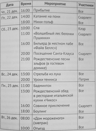 Пожалуйста, захвати с собой какую-нибудь книгу, мы можем вместе почитать вслух. Думаю, в парке можно взять напрокат настольные игры, это было бы замечательно. И должна предупредить тебя, что в нашей семье караоке — это новогодняя традиция. Целую. К.