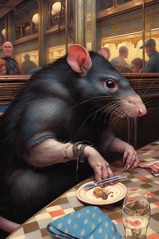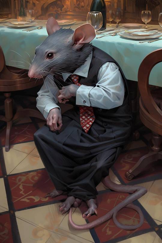 Посерьёзнее, пожалуйста, сказал я нейросети. Крыс в ресторане, на паркете, прислушивается.