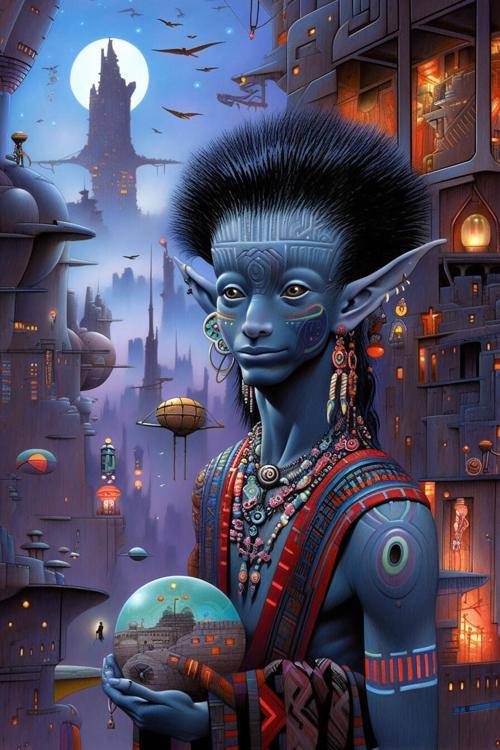 Я взялся за одного из любимых персонажей. За товарища Тама-Нго. Я его хорошо себе представляю, мне нарисовать ни разу не удалось. Ни руками, ни с помощью нейросетей. Сложный товарищ. Он, кто не читал, гуманоид с неизвестной планеты. Шаман. Темнокожий — причём не как чернокожие земляне, а в синеву такой, голубоглазый, с красными волосами и длинными ушами. Плюс — мудрый, хитрый, весёлый, в общем, это всё тоже должно отражаться на внешности.