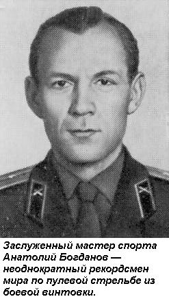 Заслуженный мастер спорта Анатолий Богданов – неоднократный рекордсмен мира по пулевой стрельбе из боевой винтовки. Установленные им в 1954 году достижения в упражнении 3х40 (1143 очка) и в стрельбе стоя (368 очков) долго стояли в таблице мировых рекордов. В 1955 году он с таким же успехом стал выступать в соревнованиях по стрельбе из малокалиберной винтовки. В упражнении 3х40 он показывает в сумме 1174 очка, а в стрельбе с колена – 396 очков (новые мировые рекорды). В следующем году А. Богданов выступает на Олимпиаде в Мельбурне. И тут он вновь одержал победу и завоевал вторую золотую медаль олимпийского чемпиона, но тогда уже в упражнении 3х40 из малокалиберной винтовки. После своих выдающихся побед в Мельбурне А. И. Богданов поступил на учебу в Военно-политическую академию имени В. И. Ленина и успешно закончил ее.