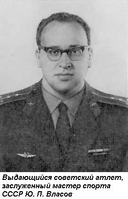 Это – тяжелоатлет лейтенант Юрий Власов, подготовленный в ЦСКА заслуженным тренером СССР Суреном Петросовичем Багдасаровым. В 1959 году Власов завоевал свою первую золотую медаль чемпиона мира. Имя офицера Советской Армии, заслуженного мастера спорта СССР Юрия Петровича Власова стало символом мужества, силы духа и воли. Выдающийся спортсмен, неоднократный рекордсмен и чемпион мира, герой римской Олимпиады, – замечательный советский гражданин Ю. П. Власов стал образцом нового, всесторонне развитого человека. Около десяти лет выступал он на мировой спортивной арене. И только страстное увлечение журналистикой и литературой заставило его покинуть большой спорт. 15 апреля 1967 года он установил свой последний мировой рекорд в тяжелом весе, выжав штангу в 199 кг.