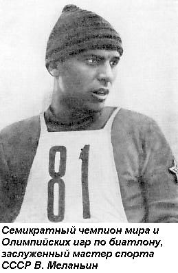 Первую золотую медаль чемпиона мира в личном и командном первенстве получил в 1959 году выдающийся армейский лыжник и биатлонист, заслуженный мастер спорта СССР Владимир Михайлович Меланьин. Он проложил путь советским биатлонистам к мировым высотам в этом сложном военноприкладном виде спорта. В 1962 году Владимир Меланьин опять становится обладателем двух золотых медалей на чемпионате мира. 1963 год. Мировой чемпионат лыжников – и снова золотые награды. Одержав блестящую победу на IX зимней Олимпиаде в Инсбруке (Австрия), В. Меланьин стал в 1964 году олимпийским чемпионом по биатлону. А всего у этого армейца семь золотых медалей чемпиона мира! Редкий случай для биатлона.