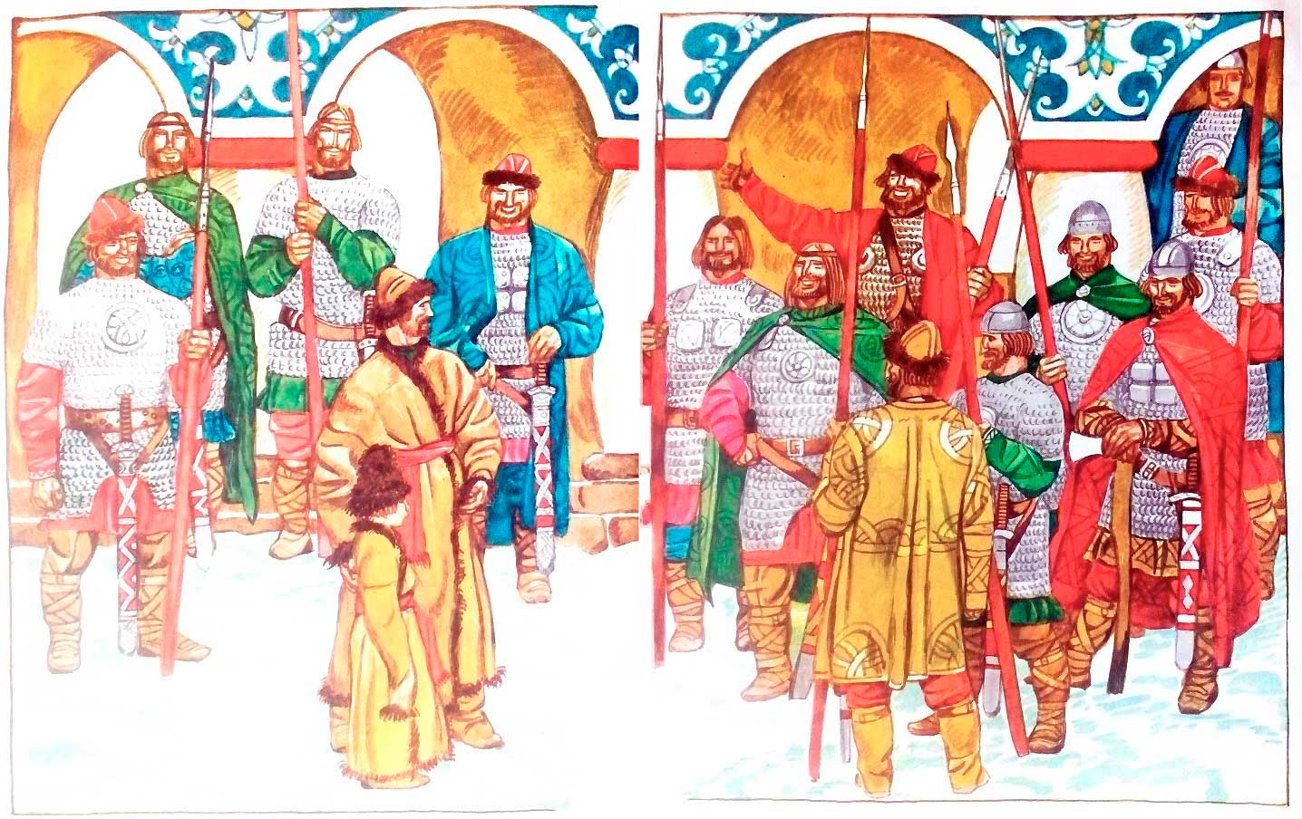 — Далече. Слыхал про такой путь «из варяг в греки»? Мы живём на его середине. С одного конца, возле тёплого моря, — греческий Царьград стоит. На другом конце, у моря холодного, — живут варяги. Бедны они, хоть и драчливы. Рыщут по свету, ищут себе службы, стола сытного, платья крепкого. Кто их кормит, за того и бьются.