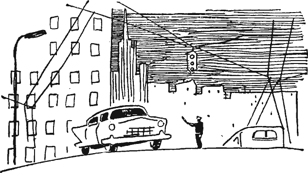 Пока я обо всем этом думал, «Волга» с шашечками миловала торжественные, сверкающие новые дома и выехала на магистраль. Пахнуло свежестью тополей, замелькали встречные автомобили и автобусы. Хорошо катить в голубом автобусе! Окна у него широченные, как витрины, смотришь через них на улицы, считаешь строительные краны и думаешь: какая же все-таки большая Москва! Но мы не завидовали автобусным пассажирам: рано пли поздно автобус сворачивал и снова ехал в центр города. А наш путь — дальше.