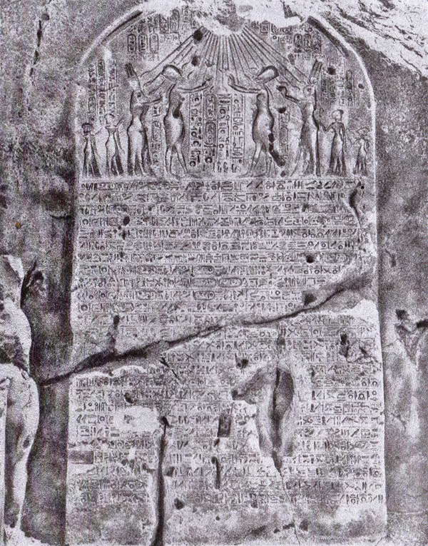 Огромная надпись гигантского памятника местами повреждена — свыше тридцати трех веков уже выдерживает она налеты ветров, песчаные бури, резкую смену температуры дня и ночи. Однако несмотря на отсутствие ряда знаков и даже целых фраз, мы можем узнать из текста интереснейшие факты: как и почему фараон Эхнатон построил в этом месте свою новую резиденцию — город Ахетатон, что значит «Небосклон Атона».