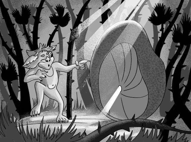 Угрюмый гремлин бродил вокруг своей избушки и вполголоса ворчал о том, как ему надоело, что других все поддерживают, любят, ценят, а вот его, Коми, никто никогда не замечает. И тут он споткнулся и полетел вверх тормашками. Но вместо того чтобы упасть в бурно разросшиеся сорняки, Коми уткнулся во что-то твёрдое как камень, но тёплое на ощупь.
