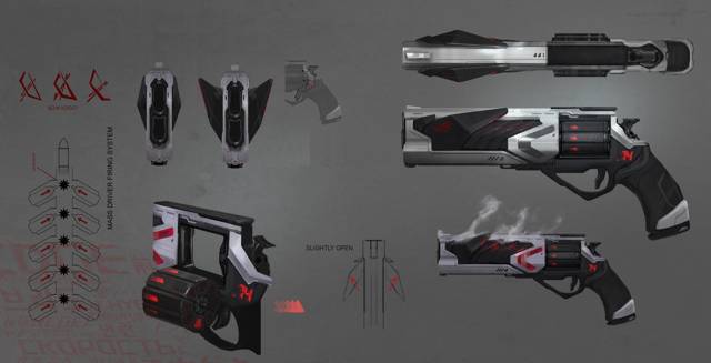 Передо мной на прилавок укладывается чёрно-белое оружие с весьма элегантным дизайном[2]. Небольшой дисплей на рукояти показывает количество оставшихся патронов. Длинный ствол утолщается к дулу. Разглядывая предмет, с удивлением замечаю два выходных отверстия.