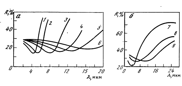 Спектральные зависимости коэффициента отражения кремния, легированного сурьмой, мышьяком и фосфором, с концентрацией свободных носителей заряда (электронов) от 7,4x1018 до 1,67x102° см– 3, и арсенида галлия, легированного цинком, с концентрацией свободных носителей заряда (дырок) от 1,7x1019 до 1,5x1020 cм– 1, представлены на рис. 2.2, где хорошо видны положение минимума на спектральных кривых отражения от поверхности кремния и арсенида галлия и зависимость длины волны минимального отражения от концентрации свободных носителей.