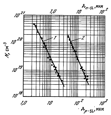 Эта особенность спектров отражения легированных полупроводников в инфракрасной области может быть положена в основу простого оптического метода определения концентрации носителей N из спектров отражения. Экспериментальные зависимости спектрального положения длины волны минимума отражения для электронного сильнолегированного кремния n– типа (?n– s1) и дырочного p-типа (?p– s1) от концентрации носителей представлена на рис. 2.3. При этом концентрация носителей в эталонных образцах определялась по измерению слоевого сопротивления четырехзондовым методом с использованием известных эталонных кривых, связывающих удельное сопротивление р- и n– кремния с концентрацией свободных носителей. Недостатком данного метода является сравнительно невысокая точность установления спектрального положения длины волны минимума отражения для слаболегированных полупроводников.