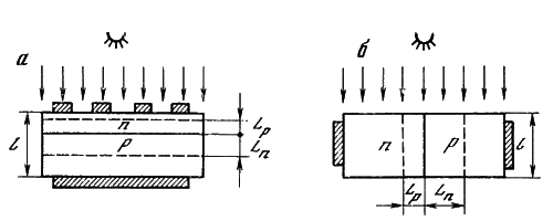 Pис. 2.6. Схема расположения p-n-перехода в полупроводниковом кристалле при перпендикулярном (а) и параллельном (б) плоскости p-n-перехода падении оптического излучения