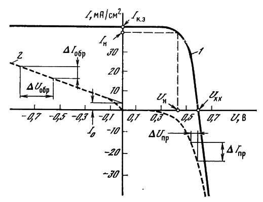 Поскольку, однако, p-n– переход солнечного элемента в рабочем режиме включен в прямом направлении (воздействие светового излучения, появление благодаря ему избыточного количества неравновесных носителей в областях полупроводника по обе стороны p-n– перехода аналогичны подключению напряжения в прямом направлении), правильнее определять ток насыщения, а также рассчитывать коэффициент А по прямой ветви темновой вольт-амперной характеристики или по световой вольт-амперной характеристике (называемой также нагрузочной световой характеристикой элемента).