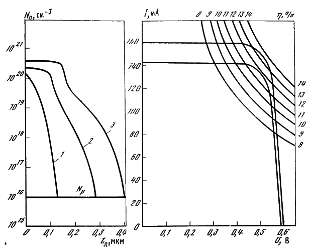 Поскольку в солнечных элементах с p-n– переходом в гетероструктурах рекомбинация на верхней границе оказывается резко уменьшенной, то эффективность собирания носителей (особенно в коротковолновой области спектра) растет и КПД таких элементов достигает весьма высоких значений.