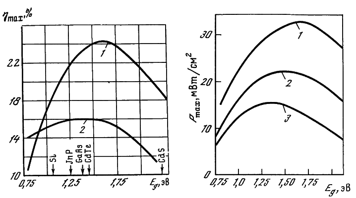 Рис. 2.13. Зависимости максимального КПД солнечного элемента во внеатмосферных условиях от ширины запрещенной зоны использованного полупроводникового материала