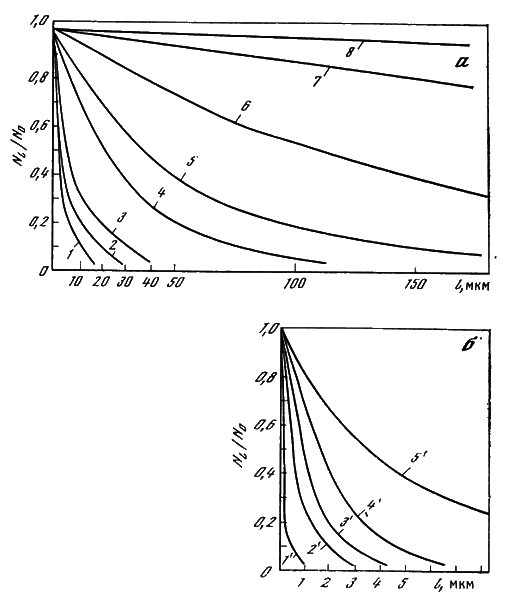 Рис. 2.15. Относительное число фотонов, доходящих до слоя глубиной l в кремнии (а) и арсениде галлия (б), для различных длин волн: