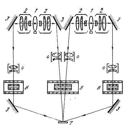 1 — вольфрамовые галогенные лампы; 2 — конденсоры; 3 — плоские фацетные отражатели; 4 — объективы; 5,6 — светофильтры для имитации спектрального состава прямого и рассеянного (диффузного) потока излучения соответственно; 7 — измеряемый солнечный элемент