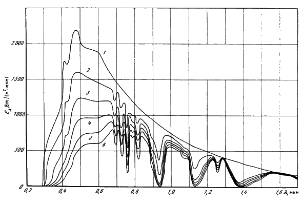 Рис. 3.3. Спектральное распределение энергии солнечного излучения при различных значениях воздушной массы (расчетные данные ?. Муна)