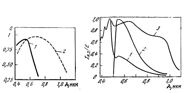 1 — аморфный кремний с р — i—n-структурой и пленкой ITО со стороны падающего света; 2 — монокристаллический кремний с р-n-переходом на глубине 0,3 мкм