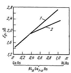 На рис. 4.9 представлена зависимость ширины запрещенной зоны AlxGa1-xAs от состава данного полупроводникового соединения (от величины х) для случая прямых оптических переходов при любых значениях х (кривая 1) и для смешанной модели — прямых оптических переходов при х<=0,4 и непрямых при х>=0,4 (кривая 2).