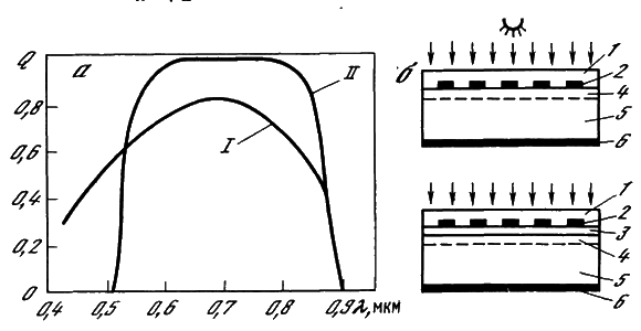 Pис. 4.10. Спектральная зависимость коэффициента собирания (а) солнечных элементов на основе арсенида галлия с гомогенным p-n-переходом (I) и гетеропереходом p-Ga0.3Al0,7As — p-GaAs — n-Ga?s (II) и схема расположения слоев в элементах обоих типов (б)