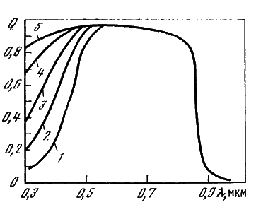 Влияние толщины и состава верхних слоев на оптические характеристики и КПД солнечных элементов с широкозонным окном-фильтром из AlxGa1-xAs и р-п-переходом в находящемся под ним монокристаллическом арсениде галлия можно проследить, сравнивая результаты работ, проведенных различными исследователями. На рис. 4.10 представлены экспериментальные спектральные зависимости коэффициента собирания носителей заряда солнечного элемента из арсенида галлия обычной конструкции с гомогенным p-n– переходом (кривая 7) и гетероструктурой на поверхности (кривая 2). Солнечный элемент с гетероструктурой имел следующий состав и толщину слоев: p– Ga0,3Alo0.7As (8 мкм), p– GaAs (0,7 мкм) и n– GaAs (300 мкм). Такие солнечные элементы позволили получить при измерениях в наземных условиях КПД более 20 %. В то же время в силу сравнительно большой толщины широкозонного окна-фильтра и низкого последовательного сопротивления эти элементы можно эффективно использовать при повышенной плотности потока солнечного излучения. Однако по этой же причине коротковолновый край спектральной чувствительности таких солнечных элементов соответствует 0,51—0,52 мкм (см. рис. 4.10).