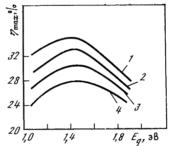 Рис. 4.12. Зависимости максимального КПД солнечного элемента с р-n-переходом в гомогенном материале от ширины запрещенной зоны полупроводника при различной степени концентрации излучения