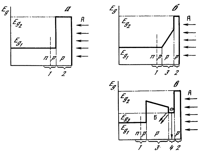 Рис. 4.13. Энергетические зонные диаграммы и схемы расположения слоев в различных солнечных элементах на основе арсенида галлия а — с переходом в гомогенном материале и широкозонным окном-фильтром на поверхности; б — с варизонной структурой в слое окна-фильтра; в — с переизлучающей структурой между двумя областями окна-фильтра; 1 — p-n-переход в арсениде галлия; 2 — окно-фильтр из твердого раствора алюминия в арсениде галлия; 3 — варизонная структура (переменный по х состав AlxGa1-xAs); 4 — переизлучающая структура; А — солнечное излучение; Б — люминесценция