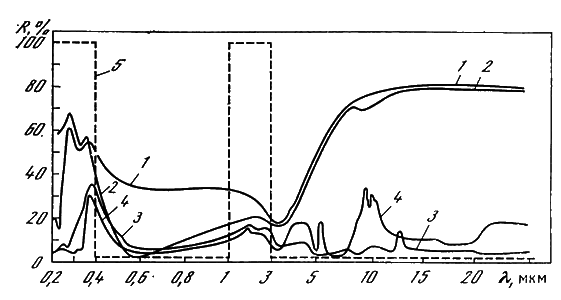 Основная трудность практического решения этой проблемы состоит в том, что, кроме защиты от повреждающего действия радиации, оптические покрытия должны обладать высокими просветляющими и теплорегулирующими свойствами, т. е. уменьшать коэффициент отражения в рабочей области спектра и предохранять солнечные элементы от перегрева путем увеличения интегрального коэффициента собственного теплового излучения поверхности ? до значений в пределах 0,8–0,9. Необходимость просветления рабочей поверхности вызвана высоким коэффициентом отражения (35–40 %) чистой полированной поверхности солнечных элементов в области спектральной чувствительности 0,4–1,1 мкдо; это означает, что без уменьшения потерь на отражение не могут быть получены солнечные элементы с высоким КПД. Увеличение собственного теплового излучения поверхности солнечного элемента особенно важно в связи с тем, что для полированной высоколегированной (концентрация примесей (1–2)x102° см– 3) поверхности кремниевых элементов без теплорегулирующего покрытия е составляет 0,19—0,24.