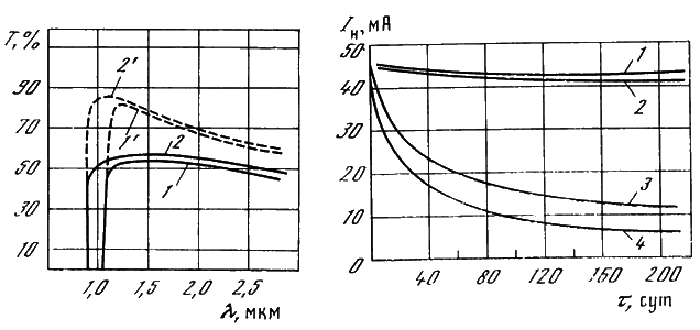 1, 2 — до просветления; 1', 2' — после просветления пленкой SiO рабочей (d = о,15 мкм) и темновой (d = 0,3 мкм) поверхностей соответственно