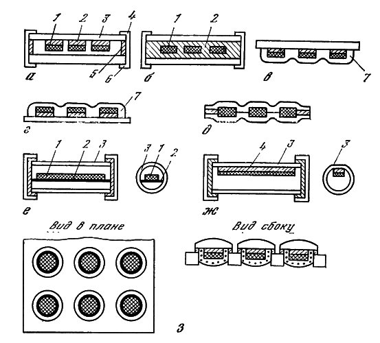 а — круглые и прямоугольные солнечные элементы 1 приклеены каучуком 2 к внешней стеклянной пластине 3; модуль изолирован по торцам металлической оболочкой 4 и резиновым уплотнителем 5, соединяющим внешнюю пластину 3 с тыльной пластиной 6 из металла или пластика; б — в конструкции а солнечные элементы 1 залиты слоем каучука 2, заполняющим все пространство между внешней и тыльной пластинами модуля; в — в конструкциях а и б тыльная пластина заменена на слой гибкого пластика или герметика 7, обволакивающего солнечные элементы с тыльной стороны; г — перевернутый вариант конструкции в, где обволакивающий слой 7 выполнен из светостойкого прозрачного полимера и обращен к свету; д — двусторонняя полимерная защитная конструкция (прозрачный пластик с обеих сторон), где могут быть использованы прозрачные солнечные элементы с двусторонней чувствительностью; е — солнечные элементы 1 приклеены к несущей полимерной или металлической подложке 2 и заключены в заполненную сухим инертным газом стеклянную трубку 3, используемую для люминесцентных ламп; ж — верхняя поверхность трубки 3 конструкции е плоская и солнечные элементы приклеены к ней снизу прозрачным каучуком 4; з — круглые солнечные элементы большой площади вклеены прозрачным каучуком в пустые лампы-фары, из которых собран модуль фотогенератора