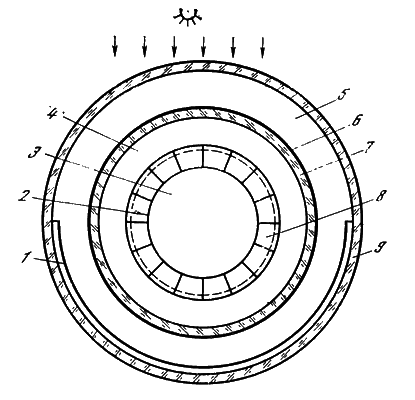 1 — отражающая металлическая пленка; 2 — теплопоглощающая поверхность; 3 — трубопровод с жидким или газообразным теплоносителем; 4 — полость, заполненная прозрачной кремнийорганической жидкостью; б — вакуумированная полость; 6 — прозрачное селективное покрытие с низким значением коэффициента излучения ?; 7, 9 — прозрачные стеклянные оболочки; 8 — монокристаллические или пленочные солнечные элементы (плоские или трубчатые)